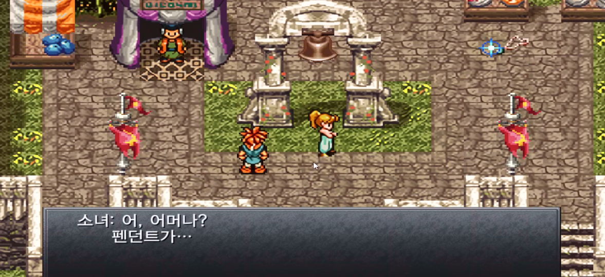 그러면 거대한 종 앞에서 한 소녀와 부딪히게 된다 이때 우측 상단을 보면 소녀가 펜던트를 떨어뜨린 것을 확인할 수 있다